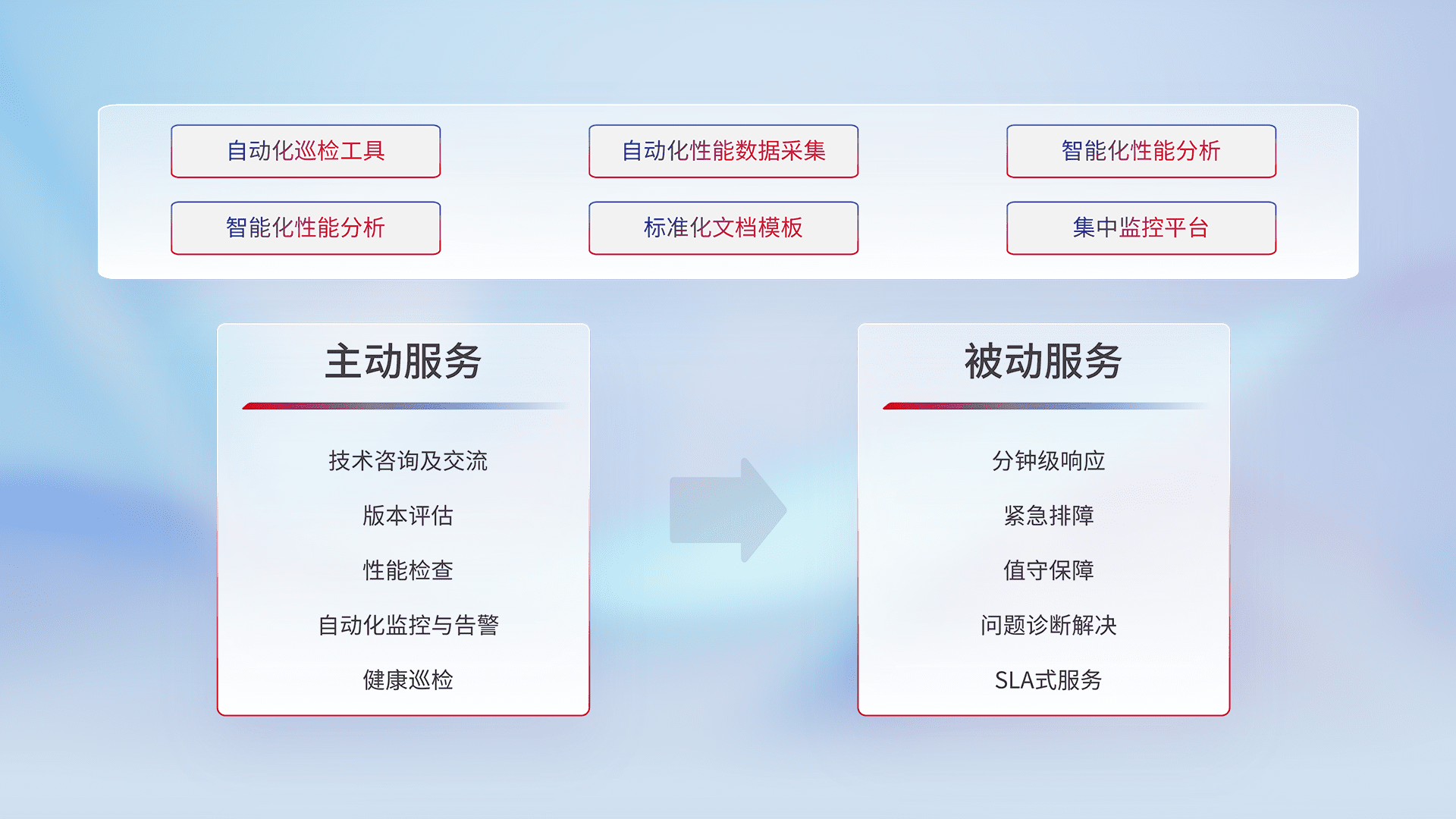 智能化工具和标准化文档,,,,保障服务质量,,,,提供主动服务(包含技术咨询、、、、版本评估、、性能检查、、、、自动化监控与告警、、健康巡检)和被动服务包含(分钟级响应、、紧急排障、、、值守保障、、、问题诊断解决、、、SLA服务)。。。。