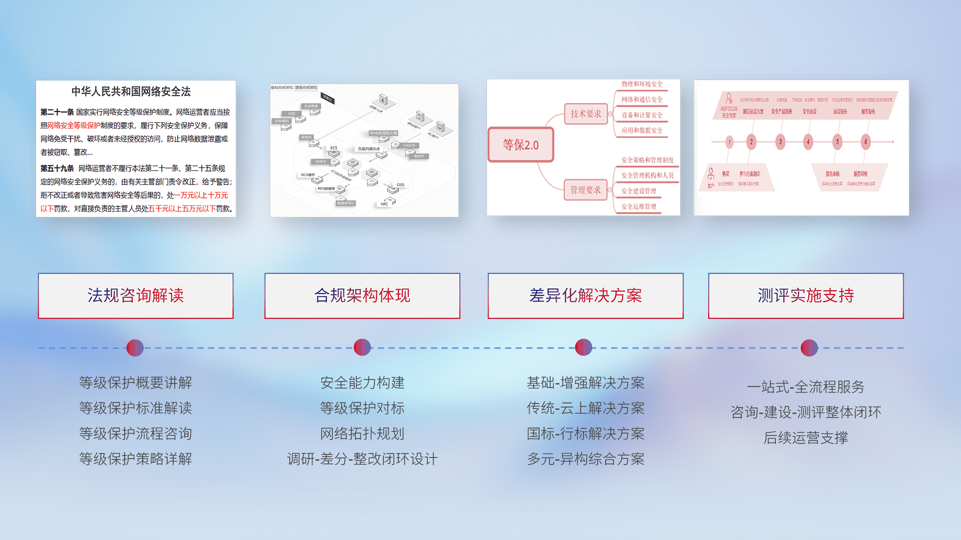 通过专业的法律咨询解读、、、、合规架构体现、、、差异化解决方案、、、、测试实施支持等服务,,,,为客户量身打造等保合规体系。。。。
