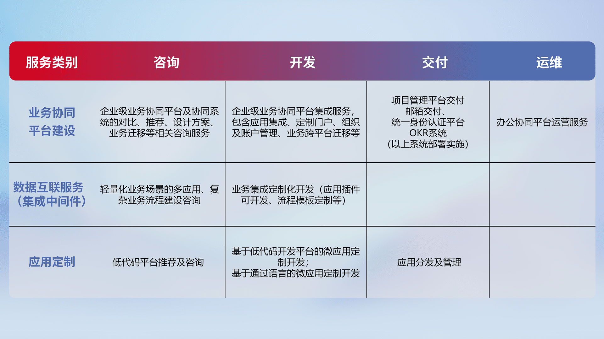 针对钉钉、、企微、、、IDaas等平台级产品提供产品的规划、、、方案、、交付、、定制化开发等服务,,,,实现如统一协同办公、、、、智能客户服务、、、混合会议管理、、智能数据查询、、、、等业务场景,,,,实现数字化转型。。。
